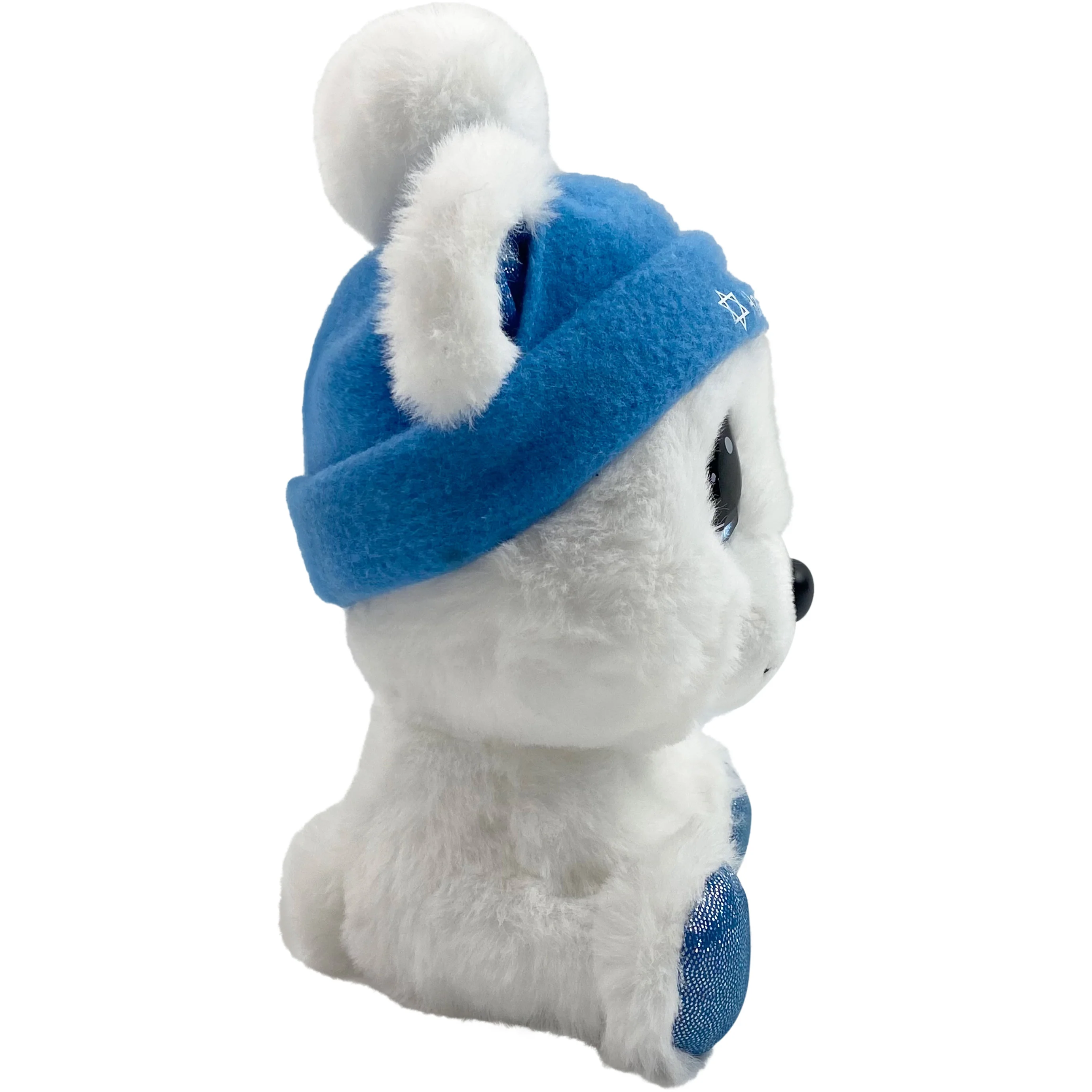 Give a cuddly Hanukkah gift for the young and young at heart, a huggable white teddy bear. Ahavah the bear is ready for the epic eight day festival! His blue hat shares a warm wish for the season and a pair of Stars of David. Ahavah canât wait to celebrate with his friends and family, sharing gifts, lighting the menorah, and eating tasty latkes. Give this cutie to sons, daughters, nieces, nephews, or anyone who would appreciate a sweet Hanukkah friend. Measures 7â H and is carefully crafted of all new materials â polyester fibers and plastic pellets. Recommended for ages 3 and up.